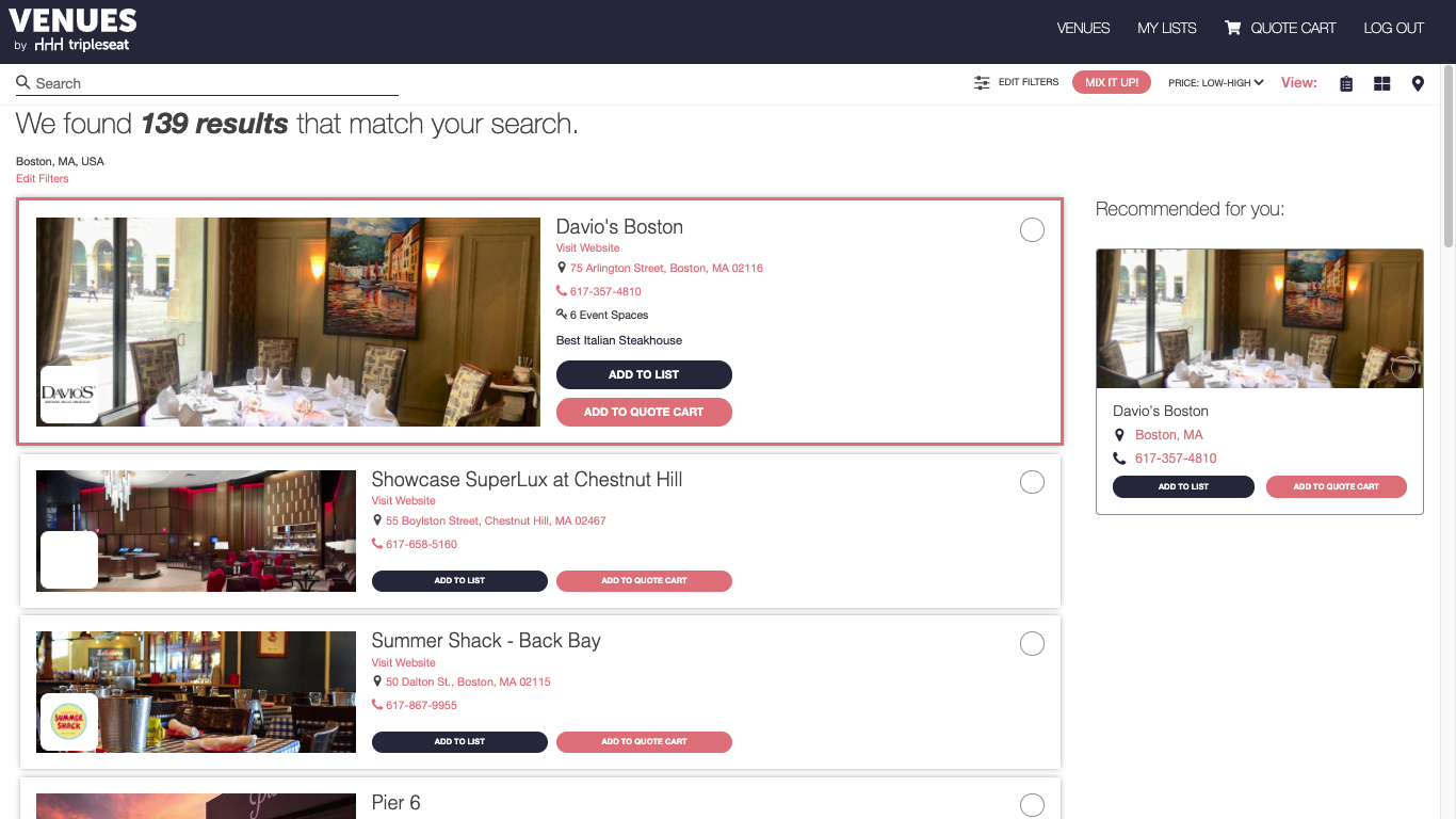 EventUp powered by Tripleseat is the leading global venue directory with more than 15,000 restaurants, hotels, and unique venues. With a curated venue listing, you’ll place your venue in front of millions of event planners globally. EventUp is your marketing resource to promote and help generate event leads to drive revenue. All Tripleseat customers receive a Basic listing with their subscription, however, if you are looking for maximum venue exposure and increased event leads - EventUp offers two upgraded premium listing packages - Premium and Premium PLUS - Promote your venue to event planners at the very moment they are searching for the perfect restaurant, hotel, or unique venue for their next party or event. With top-tier listing placement, collect more event leads driving the most revenue back to your venue.