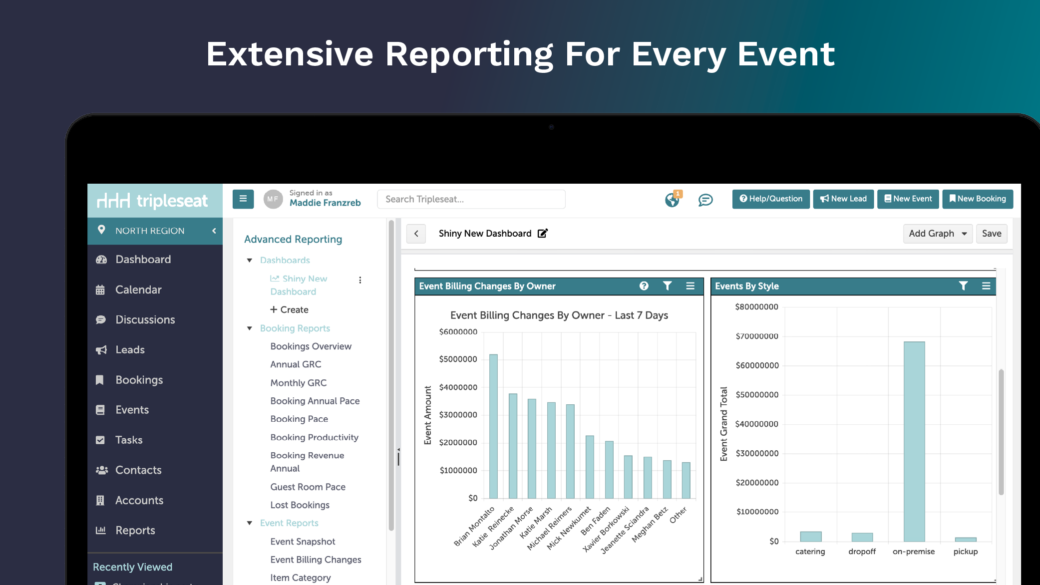 Understand your data with Tripleseat+ Insights, our business intelligence tool that will turn your sales and event data into decision-quality reports and management-ready visuals. Tripleseat+ Insights tool takes reporting to a whole new level with extensive reporting for every event you host. It allows users to take a deep dive into your data and get actionable results that will help drive your business forward. Easily create graphs and dashboards on the data that’s most important to you.