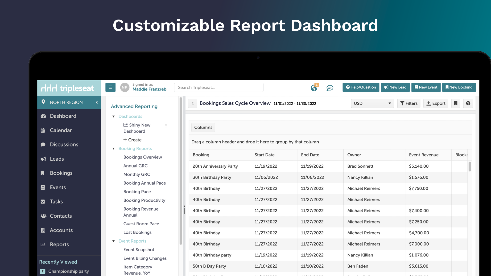 Tripleseat+ Insights is a reporting tool that analyzes your data and takes the stress of spreadsheets out of your life with intelligent reports and dashboards to help review your business.