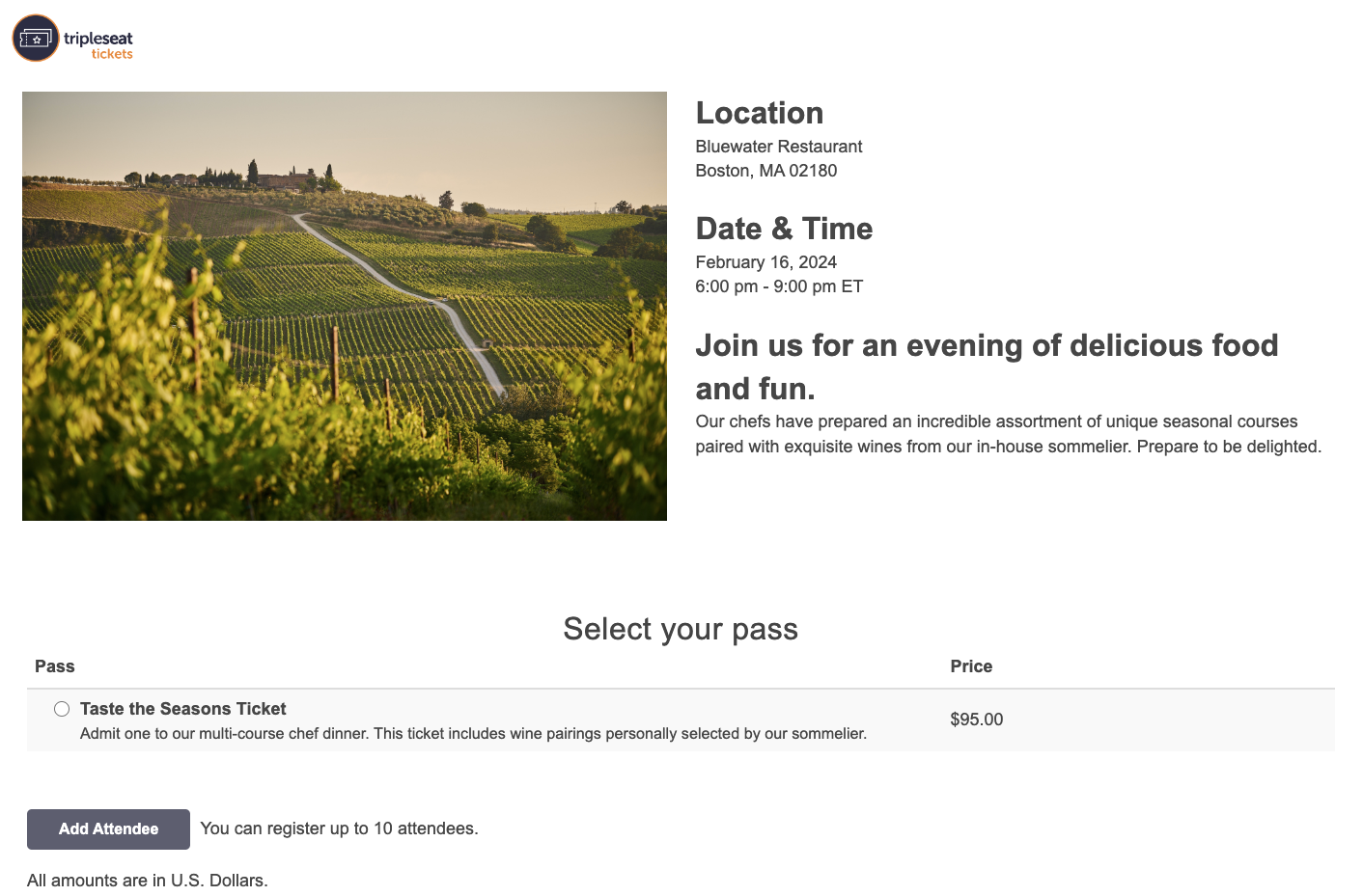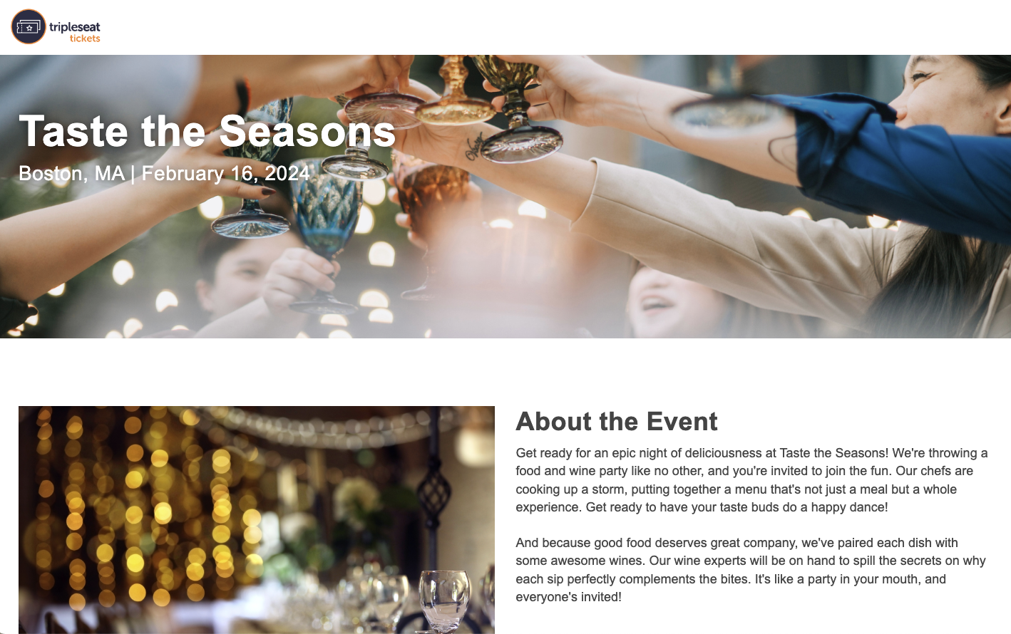 Tripleseat Tickets is an event ticketing and marketing platform to help venues create, manage, and promote events. From wine tastings to prix fixe dinners, to comedy nights at your brewery, Tripleseat Tickets helps the hospitality industry sell more tickets. With an easy-to-use ticketing solution, as well as email marketing and survey tools, Tripleseat Tickets will help you drive additional revenue in an integrated solution. Tripleseat Tickets provides you with dedicated event landing pages that you can customize to match your brand needs and easily share in branded marketing emails. Track registrations and attendee information in the dashboard and use the on-site check-in for easy post-event reporting. Share surveys with attendees following your events to receive feedback and enhance further events. *Tripleseat Tickets will only work if you have online payments enabled with one of our credit card processing partners. This can be enabled in Settings > Online Payments.